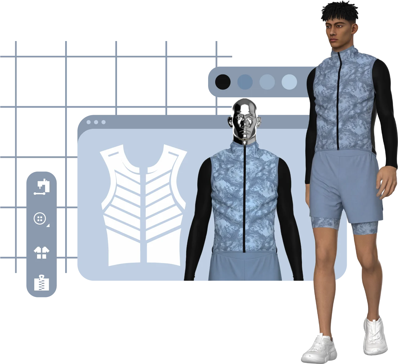 O 3D incorpora uma linguagem única que integra vários elementos, tais como, a visualização detalhada de tecidos, cores e estampados.