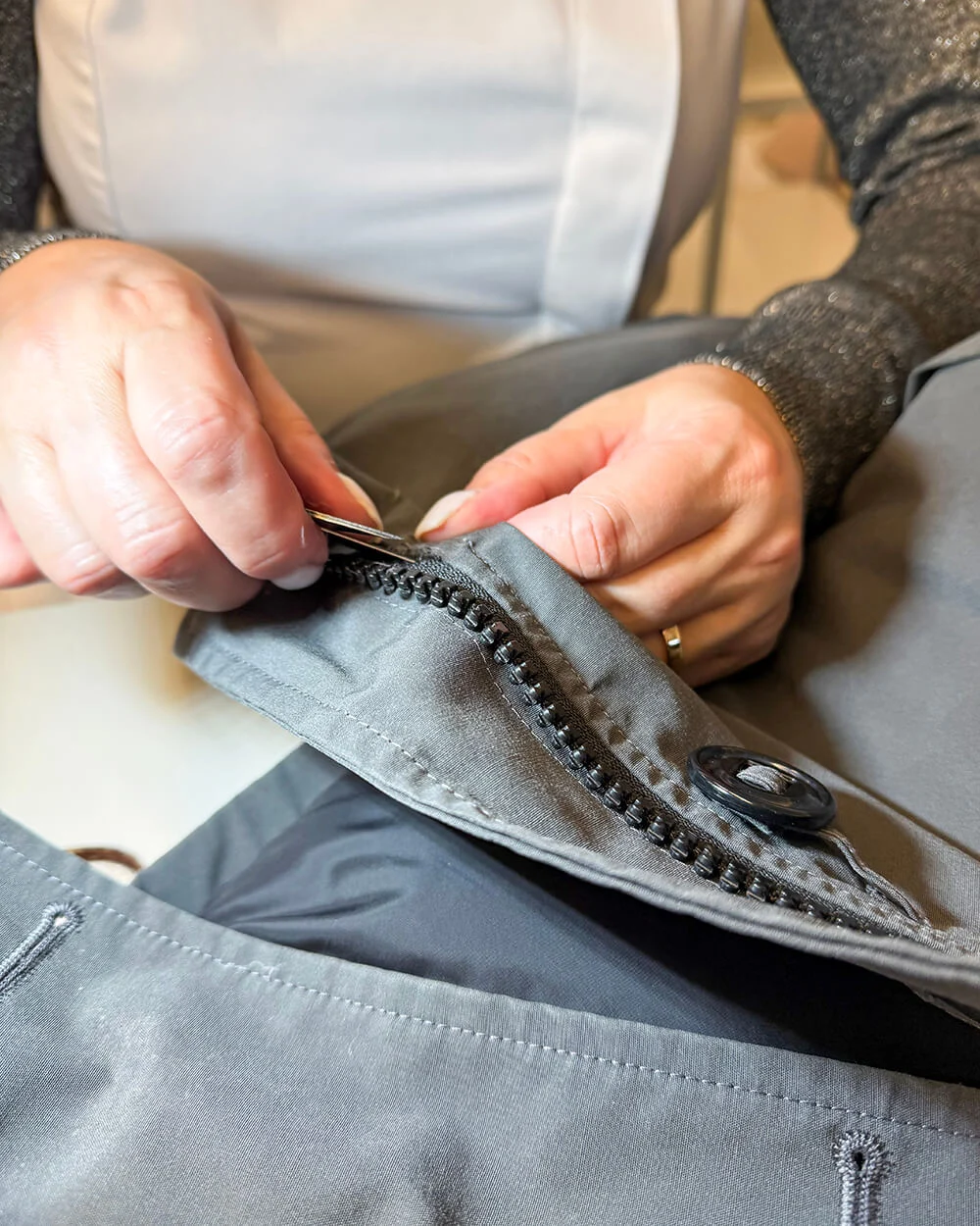 Nas nossas instalações, dispomos de um setor dedicado a prolongar a vida útil da roupa. Recebemos peças usadas que necessitam de reparação e cuidamos delas. Este é um serviço que os nossos clientes podem propor para tornar as suas roupas mais duráveis e, portanto, mais sustentáveis.